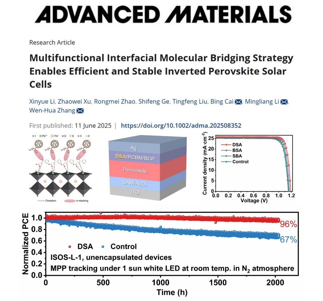 近日,云南大学材料与能源学院、西南联合研究生院张文华研究员团队在钙钛矿太阳能电池的界面调控与器件性能提升领域取得了重要进展。相关研究成果以“Multifunctional Interfacial Molecular Bridging Strategy Enables Efficient and Stable Inverted Perovskite Solar Cells”为题,发表于国际材料领域著名期刊Advanced Materials (影响因子27.4)。西南联合研究生院的硕士研究生李昕悦为论文第一作者,蔡冰副教授、黎明亮博士后和张文华研究员为共同通讯作者。