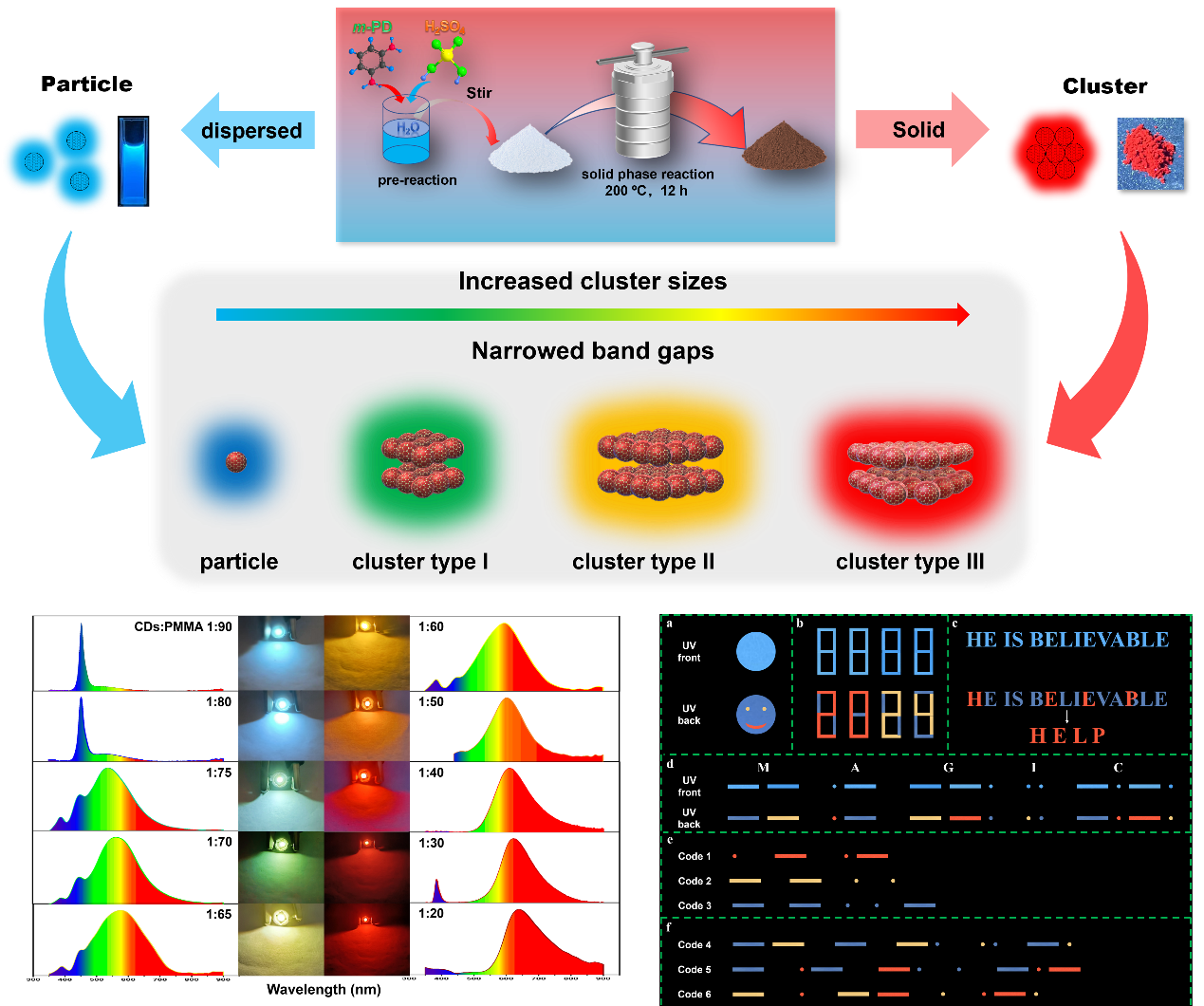 针对领域内主流研究主要聚焦于碳点分散态性质、而对其聚集态下组装与发光行为缺乏系统研究的现状,彭智利副研究员团队于2024年11月19日在国际知名材料学期刊Advanced Materials上报道了相关工作。该团队以百克尺度合成的苯二胺衍生碳点为模型,系统探究了碳点固态发光的氢键诱导自组装过程,揭示了聚集态下碳点从颗粒到团簇的发光转变机制及其调控策略。研究表明,碳点从颗粒到团簇的发光转换主要由碳点-碳点和碳点-溶剂分子间的竞争性氢键相互作用驱动。利用氢键调控的碳点颗粒-簇发光转换,团队成功实现了碳点荧光膜基于浓度及观测角度的发光调控,并将其应用于高性能可调谐LED构建、复杂信息加密系统及指纹识别。该研究有望极大地促进领域同行对聚集态下碳点发光机制的理解,并为碳点基固态发光器件的设计与制造提供全新思路。