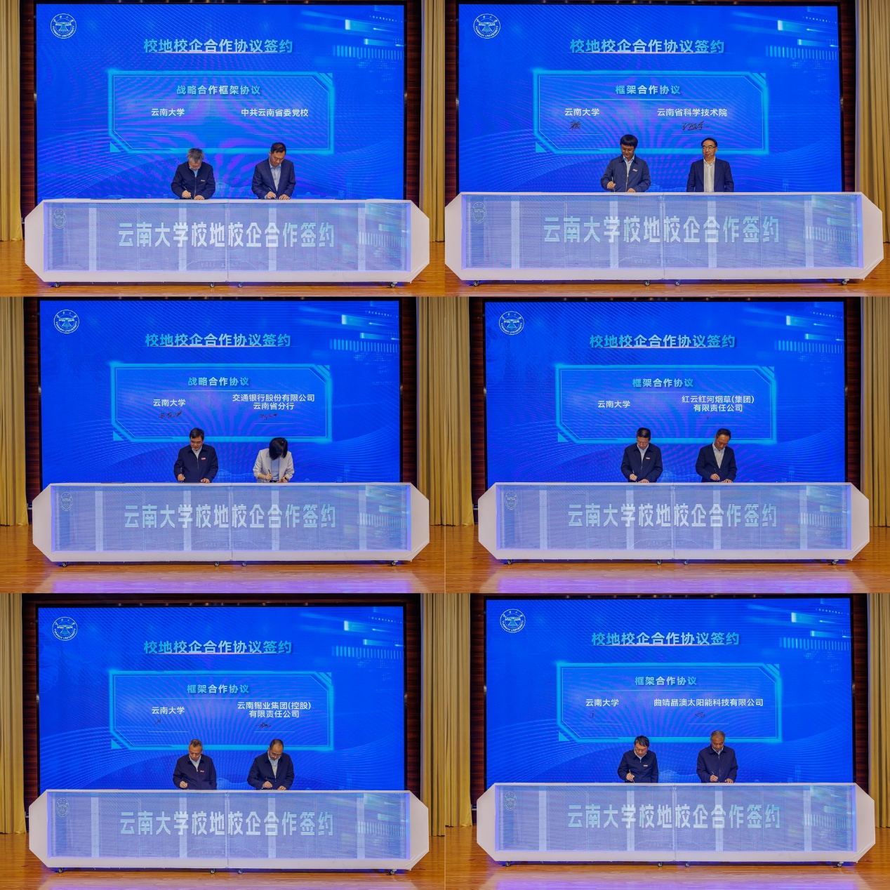 云南大学分别与省委党校、省科学技术院、交通银行云南省分行、红云红河集团、云锡集团、曲靖晶澳太阳能科技有限公司代表签署框架合作协议(共建协议)。